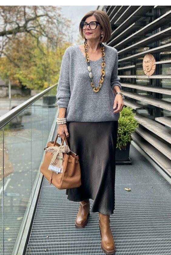 1. Струящаяся шелковая юбка-миди темно-серого цвета и светло-серый джемпер с V-образным вырезом и рукавами, поддернутыми до локтя – приглушенный и в то же время очень стильный ансамбль для современной зрелой женщины. Серую цветовую гамму эффектно оттеняют коричневые детали – крупная сумка и ботинки челси. Эффектная деталь образа – крупное украшение на шее.