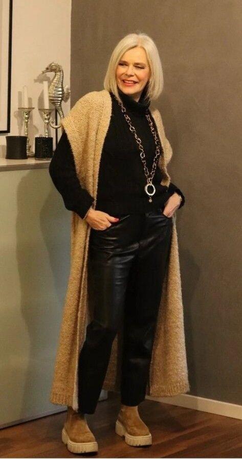 2. Черный ансамбль из кожаных брюк прямого фасона и шерстяного свитера с высоким горлом – довольно мрачноватое решение для зрелой дамы, но оно было бы таким, если бы не черный цвет не оттенил длинный золотисто-бежевый жилет без воротника и застежки. С таким жилетом, а также с замшевыми коричневыми ботинками на толстой подошве образ получается оригинальным, свежим и очень стильным.