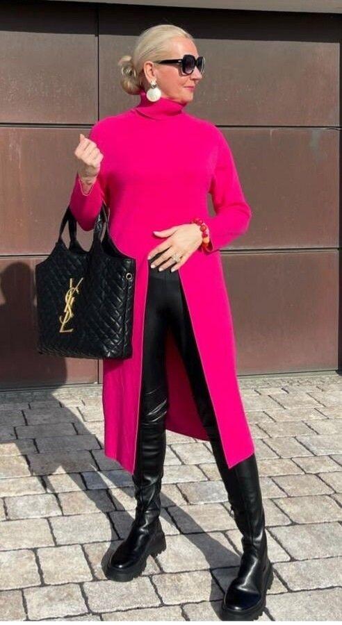 3. Ярко-розовый свитер оригинального кроя – с высоким горлом, длиной до середины голени, но с разрезом, начинающимся чуть выше пояса – подчеркнет изысканный и неординарный вкус женщины за 60. В сочетании с узкими черными кожаными брюками и высокими кожаными сапогами того же черного цвета розовый оттенок свитера не выглядит вызывающе, хотя образ все равно получается достаточно ярким и заметным.