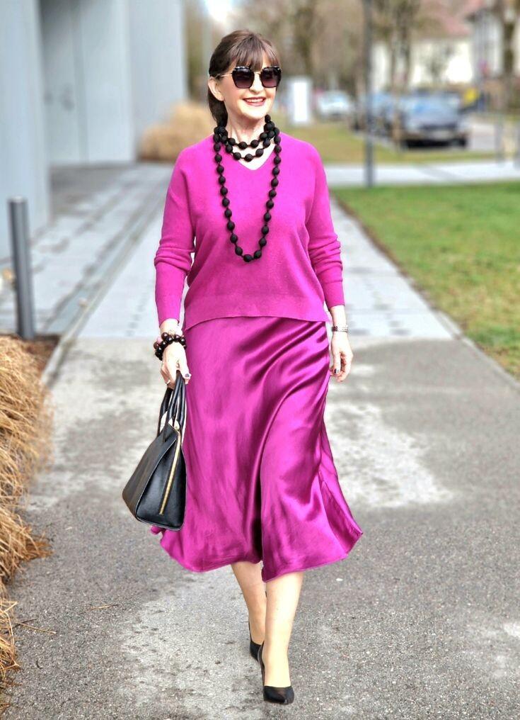 4. Сиреневая шелковая юбка силуэта трапеция хорошо смотрится в комплекте с сиренево-розовым джемпером с V-образным вырезом и очень эффектно оттеняется объемным украшением из крупных черных бусин на шее, таким же браслетом, черной дамской сумочкой и классическими туфлями на каблуках. Сочетание цветов смотрится контрастно, но уместно, придавая стильным дамам за 60 элегантности и изысканности.