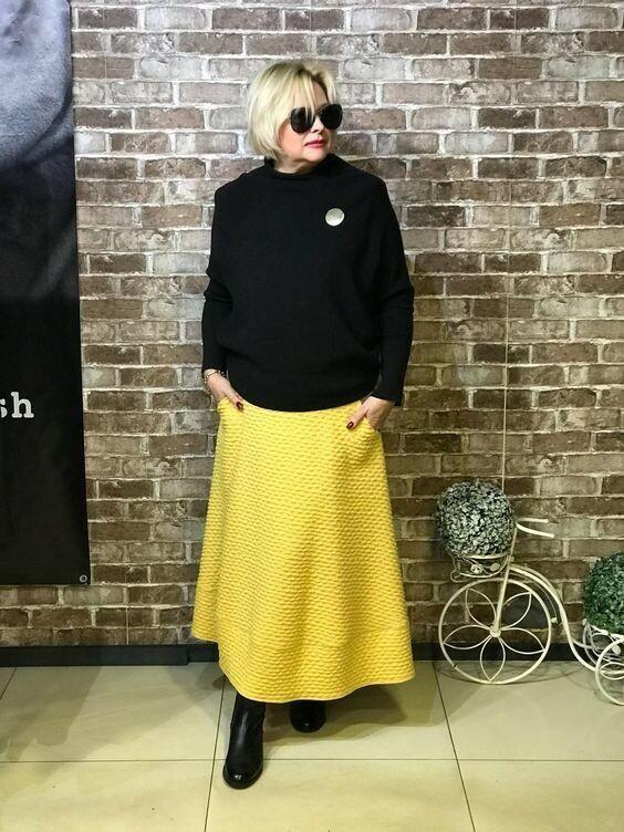 6. Фактурная яркая юбка-макси – центральная часть стильного и очень эффектного образа. Чистый цвет немного разбавляет и приглушает сопровождение черным свитером с высоким и широким горлом, с лаконичным украшением на груди, и черными ботильонами на высоком каблуке. Сочетание цветов не режет глаз, но смотрится достаточно ярко. Дама в таком образе выглядит стильно и эффектно, но также элегантно.