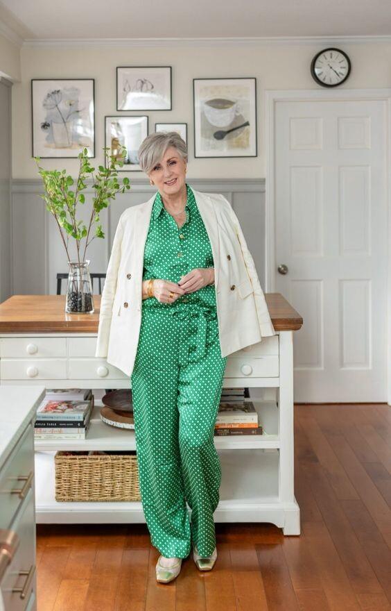 9. Изящный светло-зеленый в мелкий белый горох брючный костюм пижамного стиля, состоящим из рубашки на пуговицах и брюк с поясом, завязанным бантом, может выглядеть очень стильно и нарядно. Его для этого всего лишь нужно надеть вместе с классического кроя белым жакетом-пиджаком и изящными туфлями с квадратными носами, на плоской подошве. Такой комплект смотрится свежо, что очень подходит женщинам старше 60.