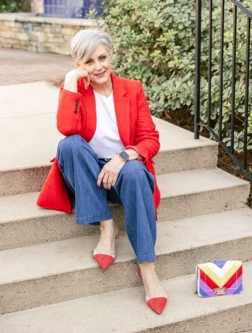 10. Прямые свободные темно-голубые брюки, белая базовая футболка и удлиненный оригинальный стеганый жакет-пиджак, а также остроносые красно-серебристые туфли на плоском ходу могут составить стильный комплект для современной модной зрелой женщины. Ничего лишнего – только базовые вещи, дополненной ноткой оригинальности благодаря жакету.