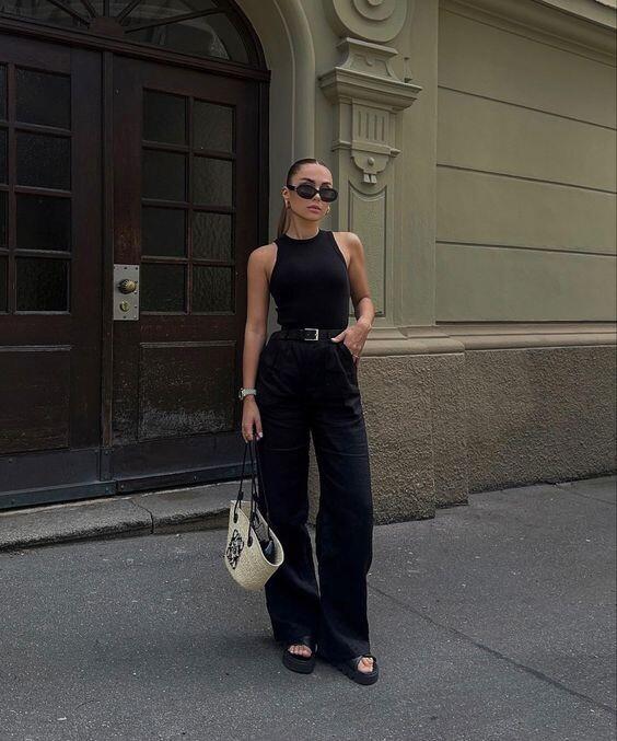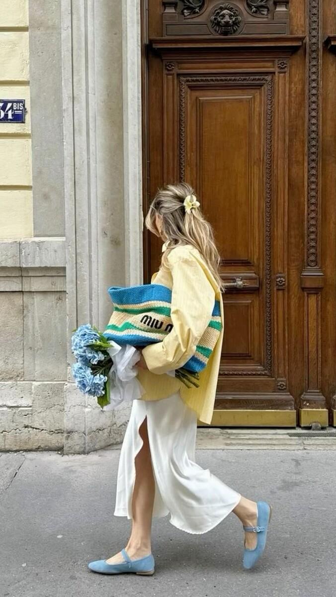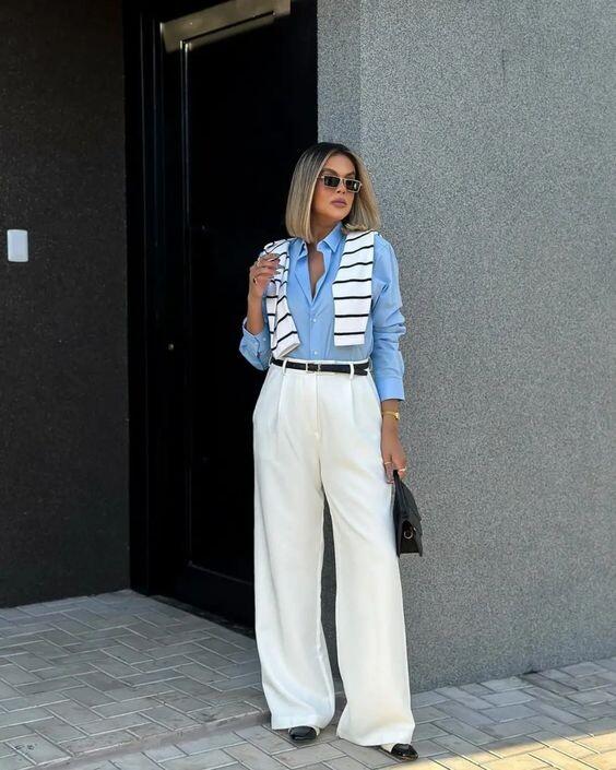 Оттенок неба не может выглядеть дёшево — это же природа. На самом деле, голубая рубашка — уже база, проверенная временем. А уж если замиксовать её с белыми брюками палаццо, остроносыми слингбэками и солнцезащитными очками — получится роскошь в чистом виде.