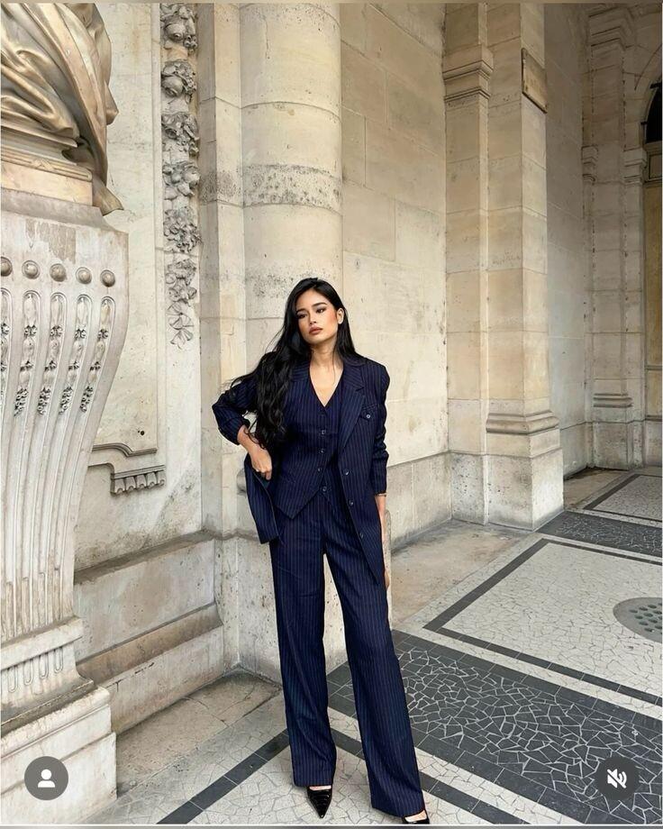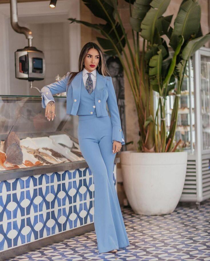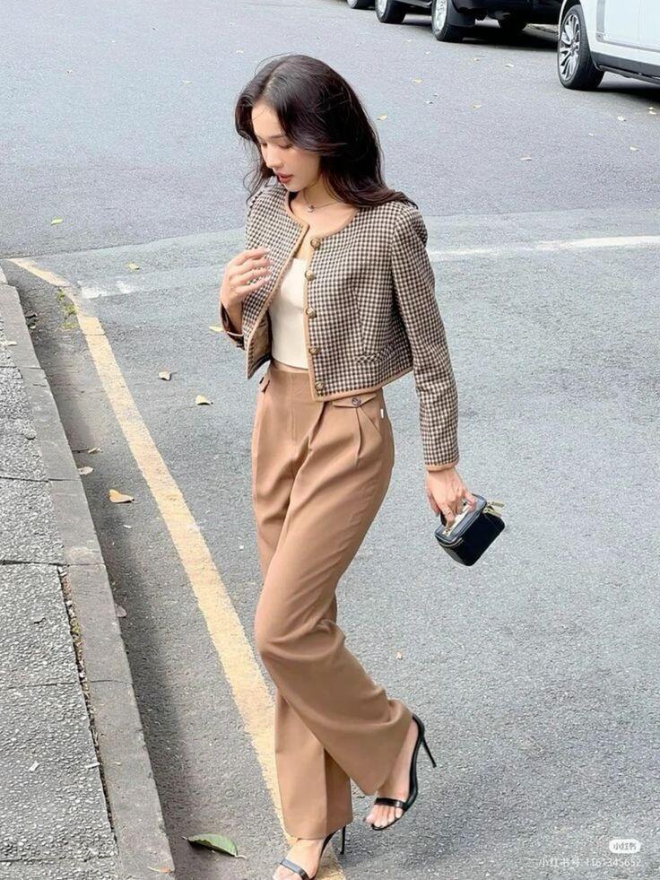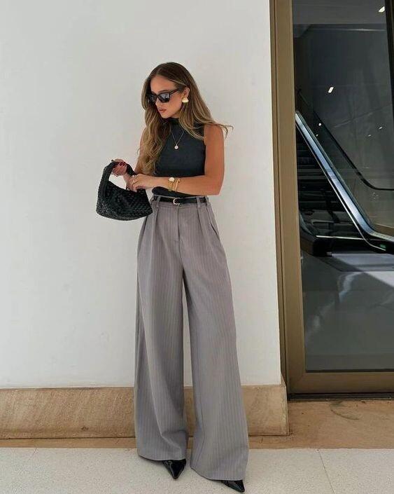 Выбирайте классический костюм-двойку, элегантное платье миди или брюки палаццо — только так получится воссоздать образ благородной леди.