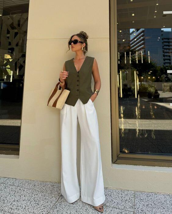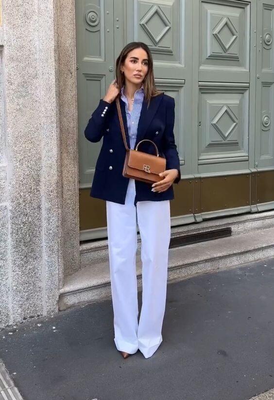 Лучше всего он смотрится в жакетах, классических брюках, офисных жилетах и футболках поло из качественного трикотажа. С ним образ по-прежнему деловой, выверенный и собранный, но уже не такой строгий, как с черным.
