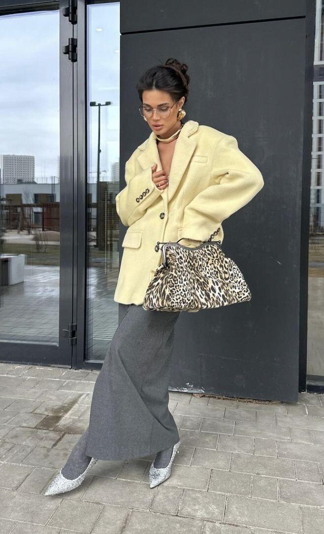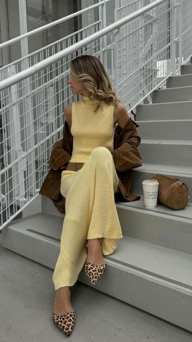 Естественно, кричащими цветами его лучше не перебивать — уйдёт весь шарм и очарование. Сочетайте жёлтый с телесным, коричневым, леопардовым принтом в бежевой гамме и нежно-голубым.