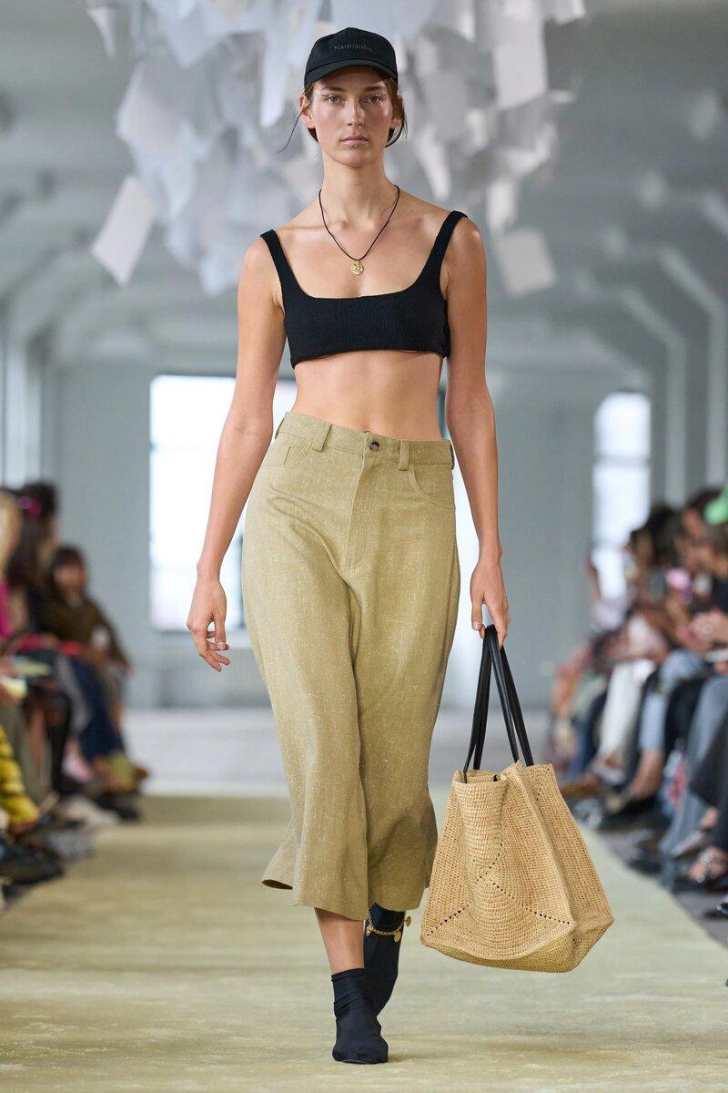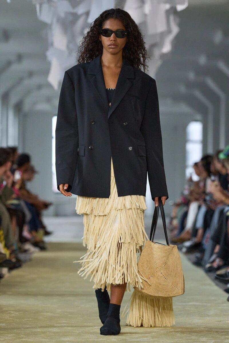 Вязаные сумки в последнее время невероятно востребованы. Они стали аналогом сумки-корзины в стиле Джейн Биркин и великолепно дополняют легкие струящиеся юбки и платья. Самыми популярными на показах в Нью-Йорке и Лондоне стали вязаные из рафии тоуты у Tommy Hilfiger, Nanushka и Ralph Lauren. К слову сказать, последний решил, что одна сумка хорошо, а две лучше.