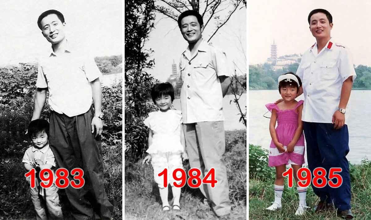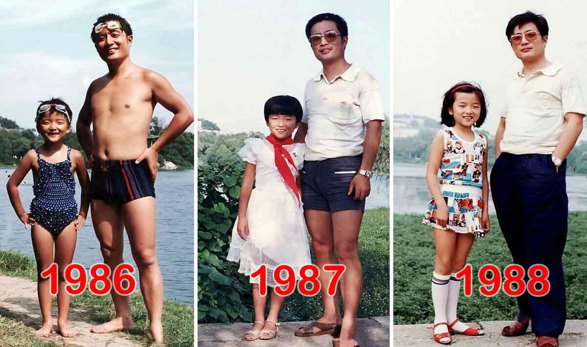 Например, в 1986 году отец с дочерью запечатлены счастливыми в купальных костюмах. Видно, что в этот раз они решили не ограничиваться лишь прогулкой по берегу озера и решили поплавать в нем. Очень бросается в глаза снимок от 1987, на нем Хуа выглядит немного грустным, может по тому, что его дочка выросла и пошла в школу в первый класс.