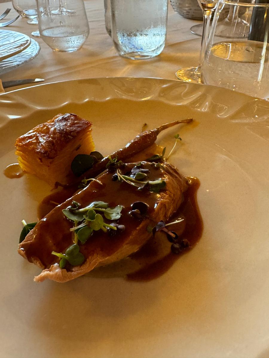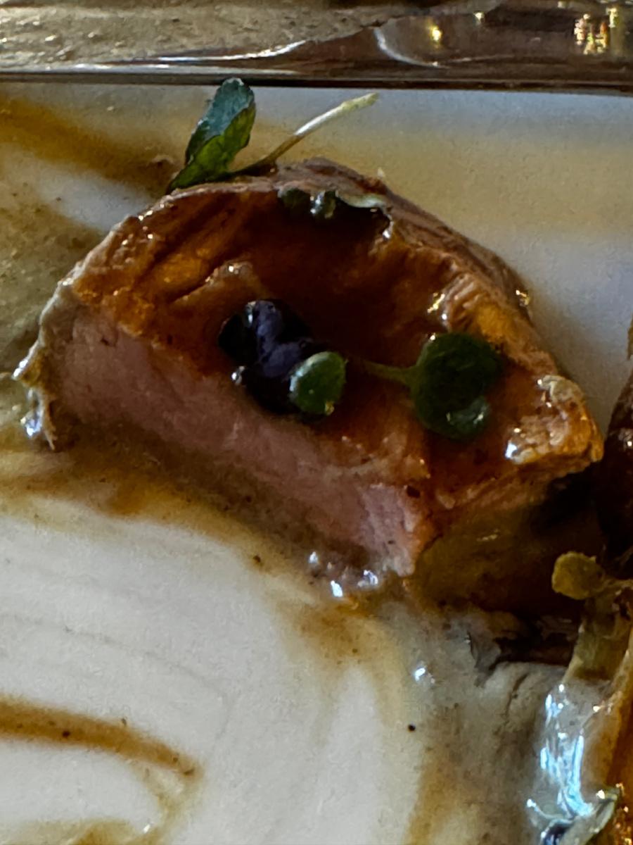 Затем — горячее. Это был стейк из свинины в фисташковом соусе.