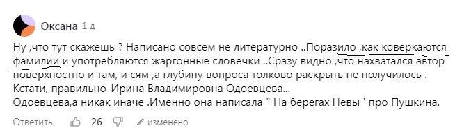 Ежегодно сотни книг о Пушкине выходит, сотни научных публикаций (см. обзор по ссылке ниже). А Оксана только детскую книжку «На брегах Невы» Марианны Басиной знает и ту путает с книгой Ирины Одоевцевой с похожим названием. И считает, что слаще морковки ничего нет в мире.