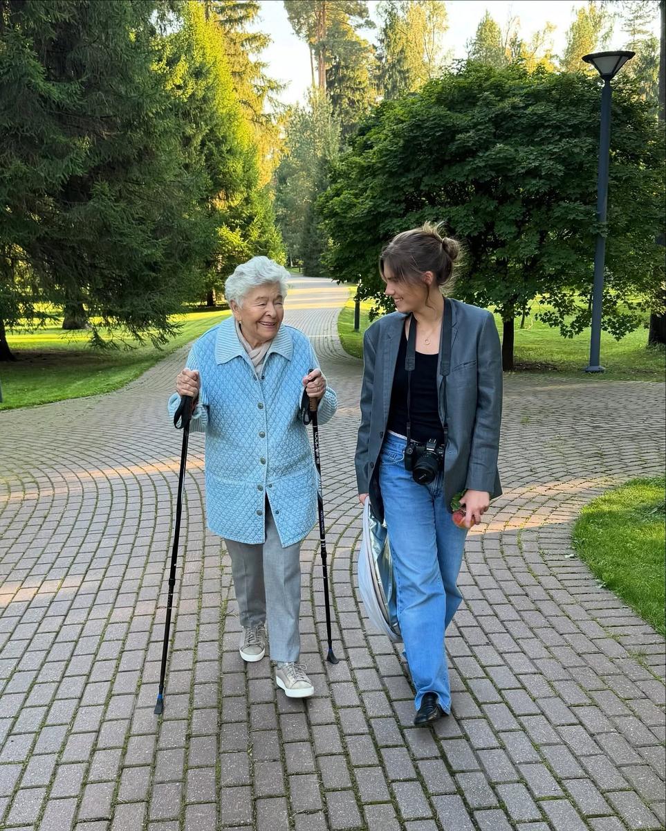 В 93 года она берёт скандинавские палки и выходит в парк. Тысяча шагов — не меньше. Потом гантели, зарядка. Дочери следят за этим строго, как за государственной программой.