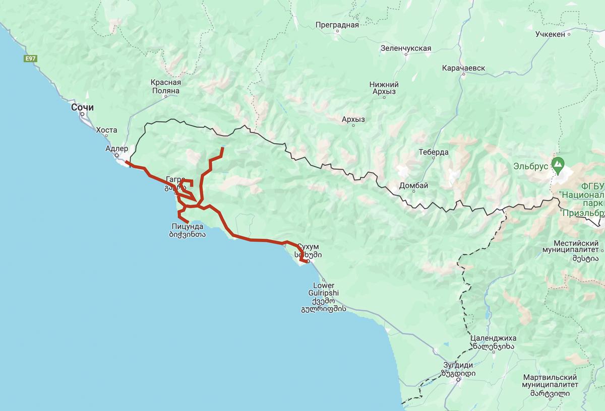 В Абхазию я приехал на велосипеде и за 7 дней преодолел около 400 километров. Вот примерный маршрут: