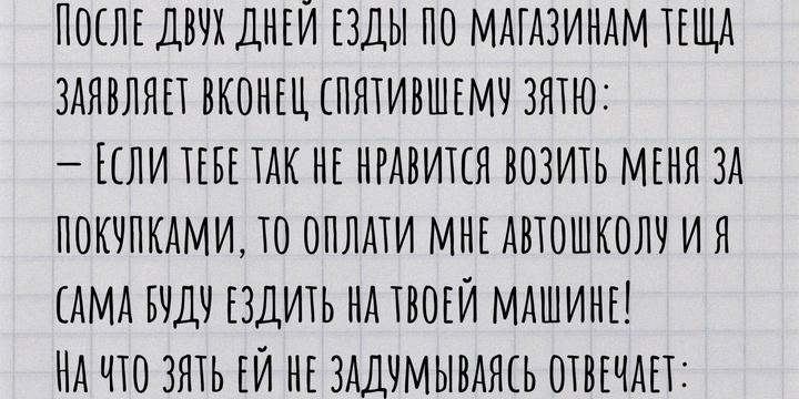 После двух дней езды по магазинам теща заявляет вконец спятившему зятю: