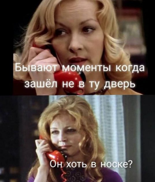 Самый знаменитый кадр из фильма Игоря Масленникова постоянно подписывают по-разному. И всегда смешно! Думаю, мемы про гречку и оливье до 9 января вы хорошо помните, поэтому публикую два других – более редких, но не менее остроумных.