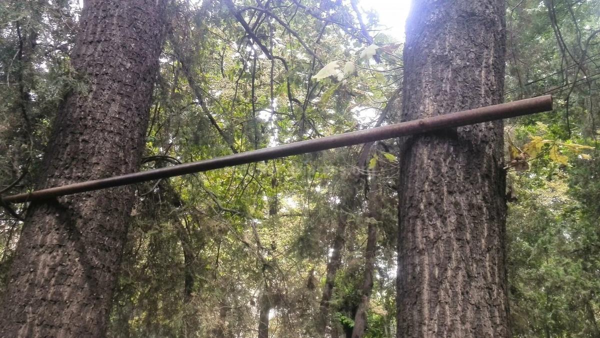 Начнём, пожалуй, с чего-то очень простого и понятного – с турника между деревьев. Во времена «страны советов» мальчишки чётко знали, что нужно сделать, чтобы организовать спортивную площадку в приглянувшемся месте – брали ровную трубу и при помощи гвоздей приколачивали к двум соседним деревьям.