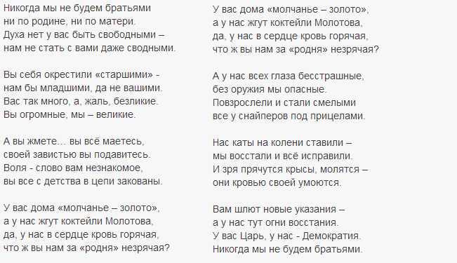 На Украине после второго майдана чрезвычайно модно стало устраивать антироссийские заявления. Характерный пример — знаменитая поэтесса Анастасия Дмитрук с ее «Никогда мы не будем братьями», обращенными к русским якобы от лица всего украинского народа.