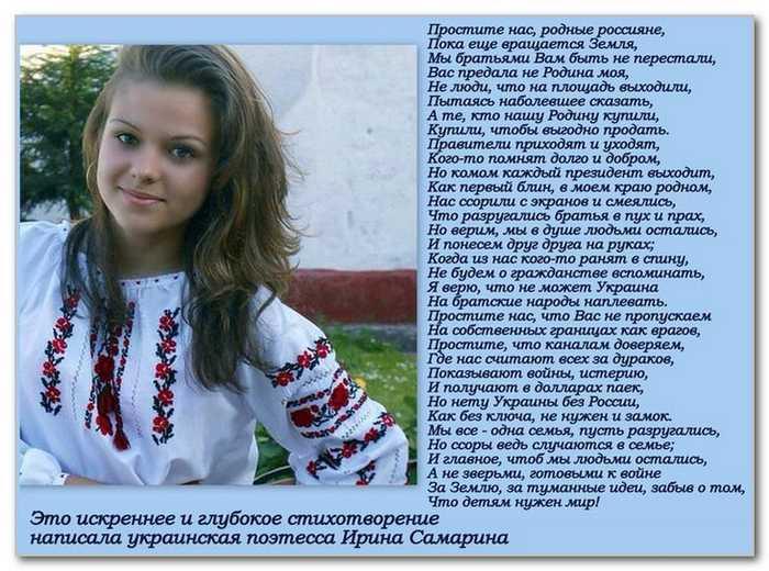 Но далеко не все знают — среди украинцев тогда нашли и те люди, что отвечали на подобные строки. Например, Насте Дмитрук ответила украинская же молодая поэтесса — полтавчанка Ирина Самарина.