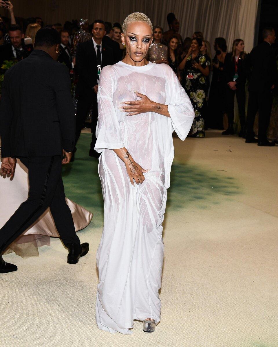 В этом, крайне странном наряде, Доджи явилась на бал Met Gala. Белая и словно мокрая футболка, облегала фигуру Доджи – тех, кто оценил замысел дизайнера Демны Гвасалия нашлось не много.