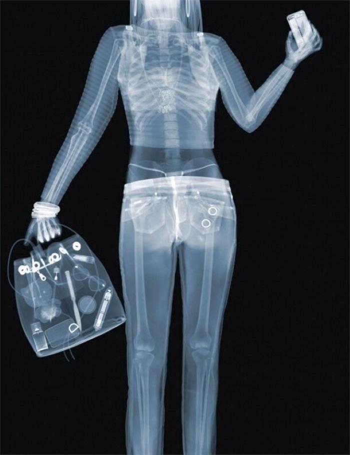 На этих снимках менее плотные — мышцы, кожа и прочие ткани человека выглядят светлыми. А металлические браслеты, оружие, часы, пряжки и даже пирсинг — тёмными. Примерно вот так: