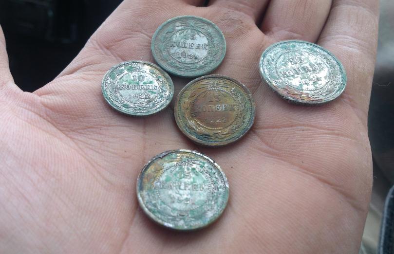 Серебряные монеты, 1921 год. Сначала мне показалось странным, что на монетах зеленый налёт, как на меди. Но потом узнал, что это билон — смесь серебра и меди. Серебро пятисотой пробы.