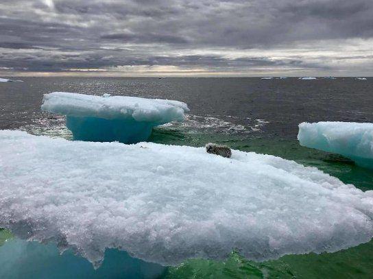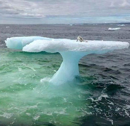 Рыбаки рыболовецкого судна случайно наткнулись на льдину в форме гриба, на которой находилось животное.