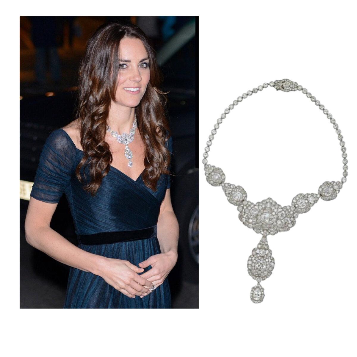 Колье, у которого нет истории происхождения, ранее его не видели на монарших особах британской короны. Дорогое украшение вызвало настоящий бум после выхода в нем герцогини королевскому дома пришлось сделать заявление, что это подарок герцогине на свадьбу.
