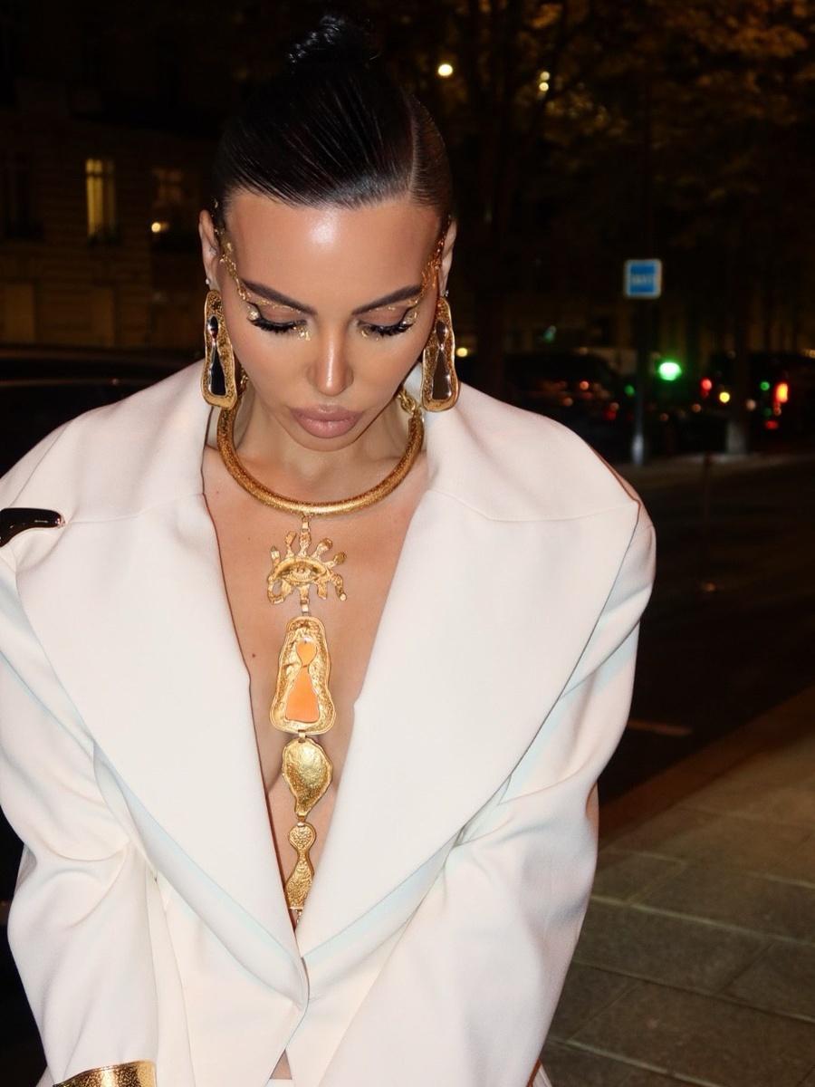 Для выхода она выбрала total look от Schiaparelli, сделав ставку на характерные черты Дома: графичные линии, объёмные формы и ювелирную пластику металла.