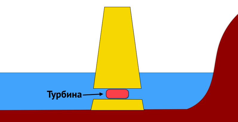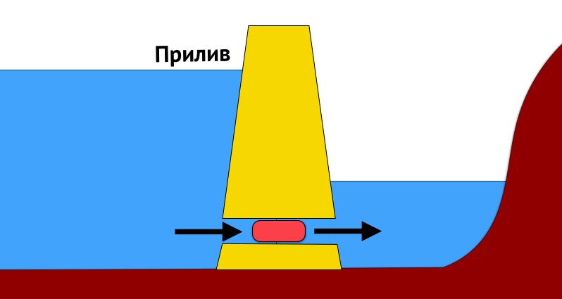Во время прилива уровень воды с одной стороны дамбы повышается и гидроагрегат вращается, вырабатывая ток.