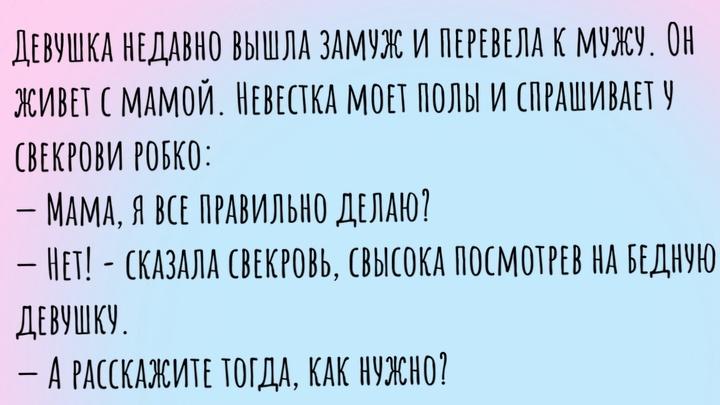 Девушка недавно вышла замуж и перевела к мужу. Он живет с мамой. Невестка моет полы и спрашивает у свекрови робко: