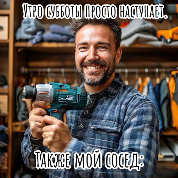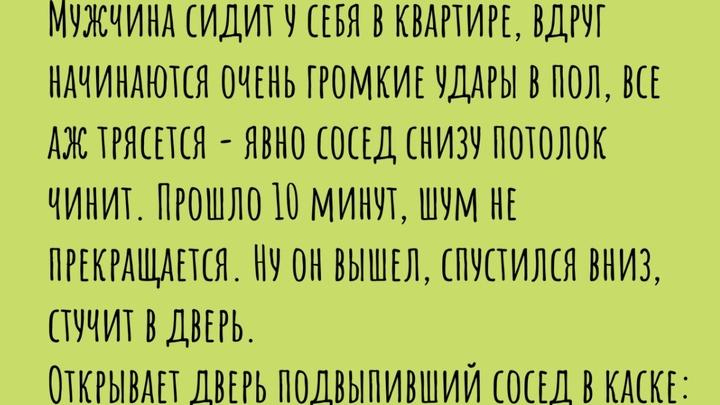Мужчина сидит у себя в квартире, вдруг начинаются очень громкие удары в пол, все аж трясется — явно сосед снизу потолок чинит. Прошло 10 минут, шум не прекращается. Ну он вышел, спустился вниз, стучит в дверь.