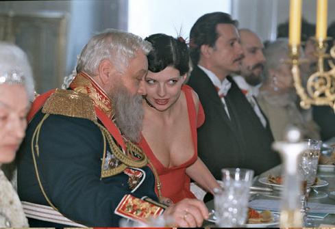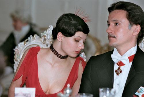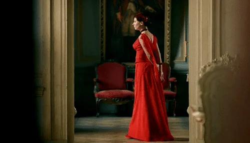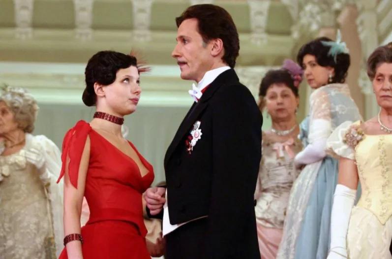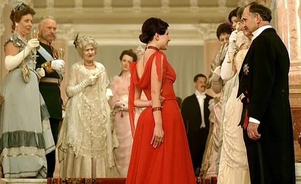 Актриса потом рассказывала в одном из интервью, что «художник по костюмам сшил мне красное платье для бала, летящее, с огромным декольте. Когда я его надела, вся съемочная группа десять минут не могла работать». Съемочную группу можно понять — декольте действительно глубокое. Но признаюсь честно — само платье мне совершенно не нравится. Пусть оно не похоже не наряд, описанный в романе, этот-то ладно, но ведь оно… невнятное. :)