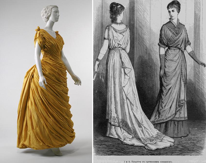 Что ж, наряды в античном стиле тогда вполне могли быть! Другое дело, что их интерпретировали в соответствии с текущими модными тенденциями. Под всеми этими складочками жёсткая основа. Да, даже под этими греческими туниками из кисеи или газа на иллюстрации справа есть нижние платья, которые предлагалось шить из плотных тканей вроде бархата или атласа: