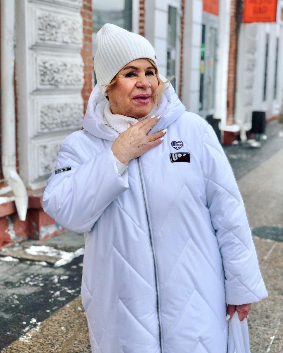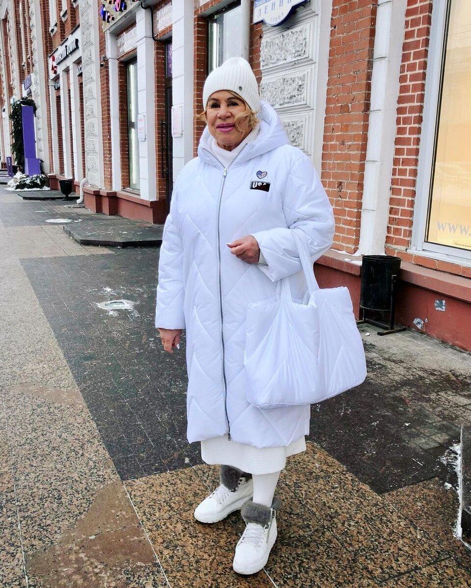 Здесь уже сложно говорить о подчеркивании фигуры и грамотной длине пальто. Просто потому, что женщина явно разменяла восьмой десяток. Однако желание наряжаться и выглядеть элегантно у неё сохранилось.