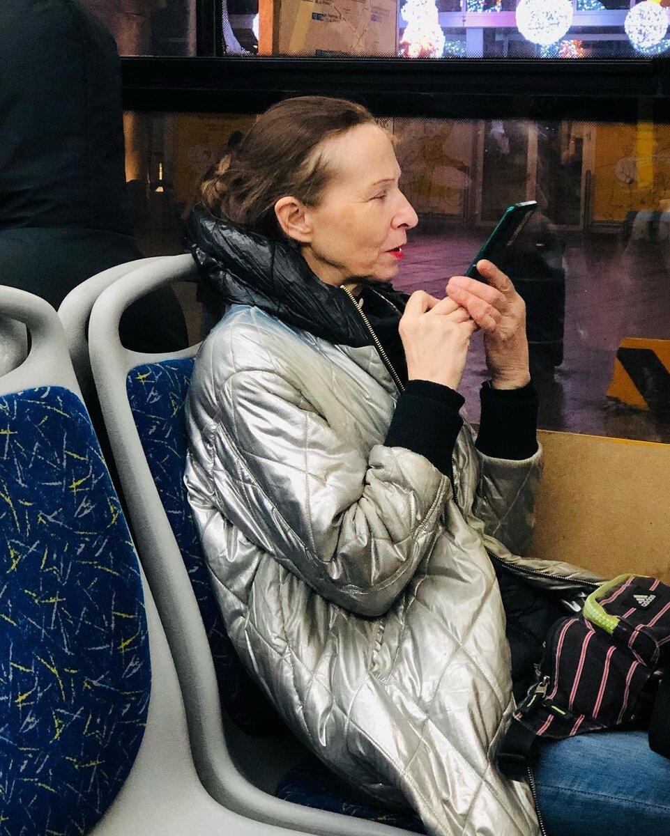 Куртка под серебро в спортивном стиле и простые джинсы скинни, но почему пассажирка выглядит настолько утонченной и элегантной? Вы чувствуете, как сквозь экран просачиваются хорошие манеры, правильная речь и чувство такта? Я — да.