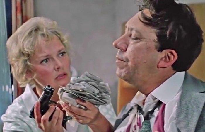 А между двумя характерными комедийными образами: бой-бабы советского розлива и блондинки-дивы, должна явиться обычная советская женщина, в кудряшках — образцовая мать и жена. Любая на ее месте отказалась бы, что она и пыталась. Но Гайдай уговорил. И она сумела эту роль из пресной превратить разом в комическую, драматическую и лирическую. Сцена, где она, пытаясь пробудить беспробудно пьяного мужа, трясет его, раскрасневшись, в ярости дуя себе на челку, наконец, заводит будильник, чтобы трагическим голосом спросить, откуда у него пистолет и деньги, и получить умиротворенный ответ: «Оттуда», — один из блестящих эпизодов комедии положений, где она гениально солирует.