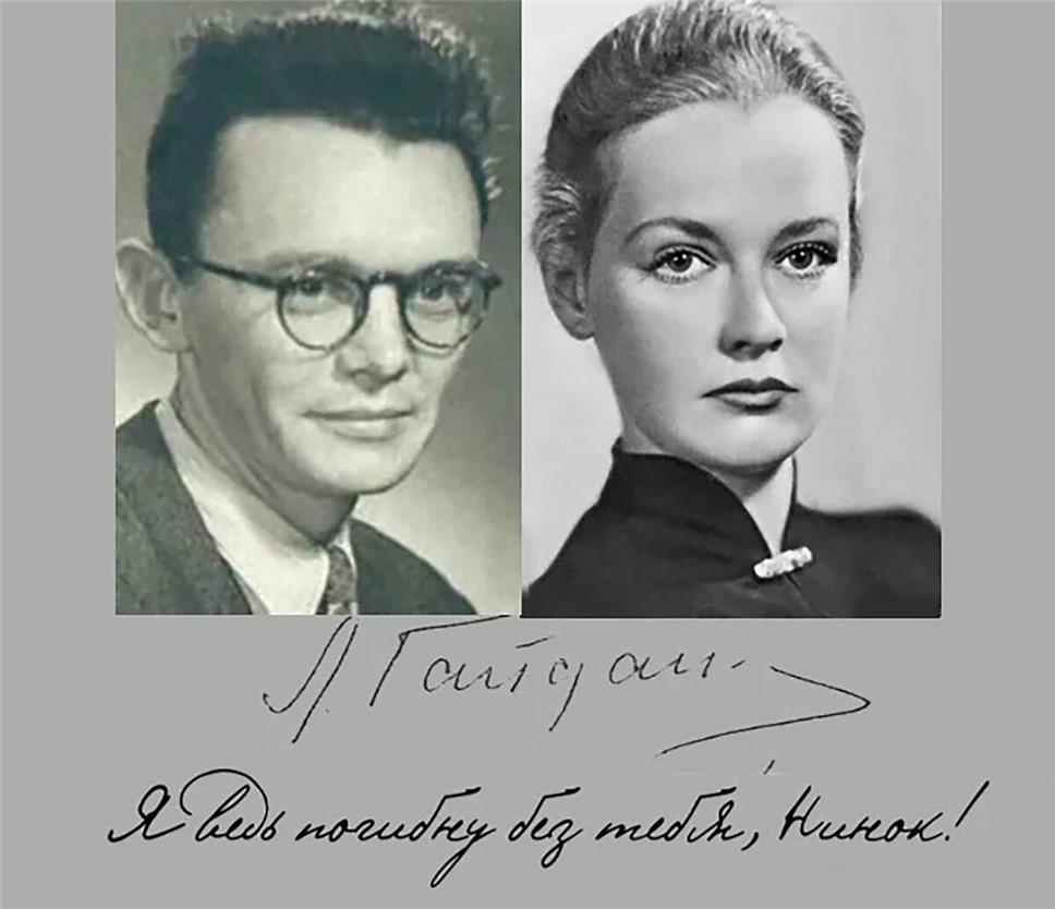 «Такой серьезный, высокий, худой, в очках, к тому же староста курса, сталинский стипендиат. Доброжелательный и при этом без столичного лоска. Не могу сказать, что сразу в него влюбилась. Вот репетируем: сижу спиной к двери. Ребята заходят — один, второй. Вроде, ничего не происходит. А входит Гайдай — я чувствую его просто кожей»,- не раз вспоминала Нина Павловна.
