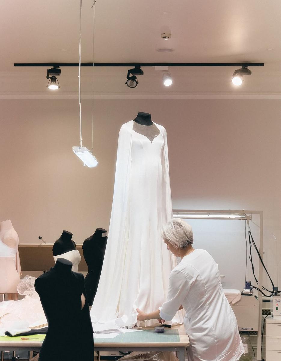 Платье невесты сшил российский бренд EDEM. Свободный крой и рукава — кейпы, идеальный вариант для беременной невесты.