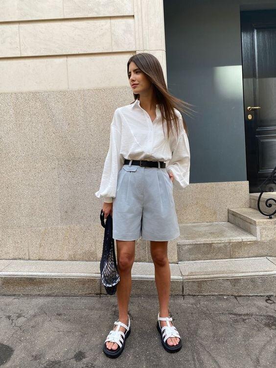 Длина шортов может быть любой — как короткие, так и длинные, до колена. Но закрывать колено всё же не стоит — так сразу визуально укорачиваются ноги.