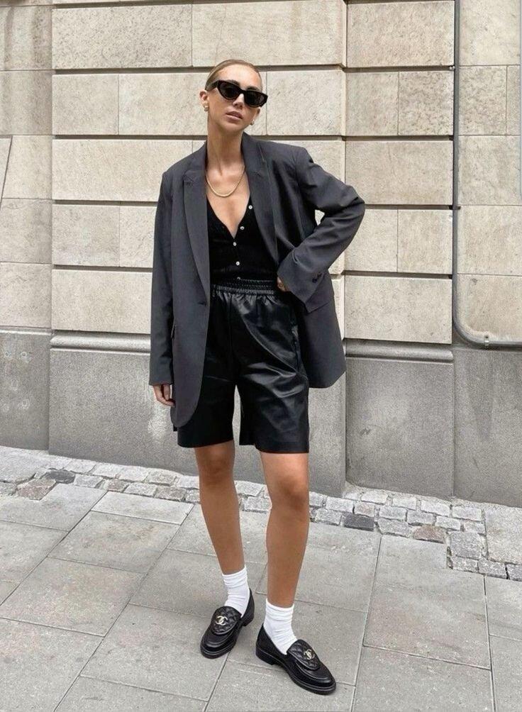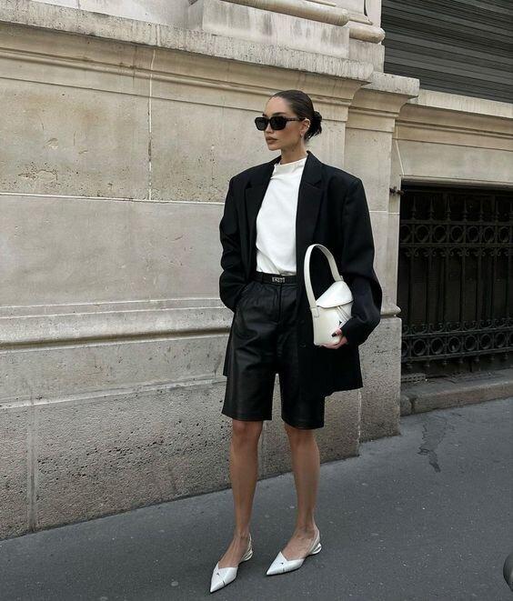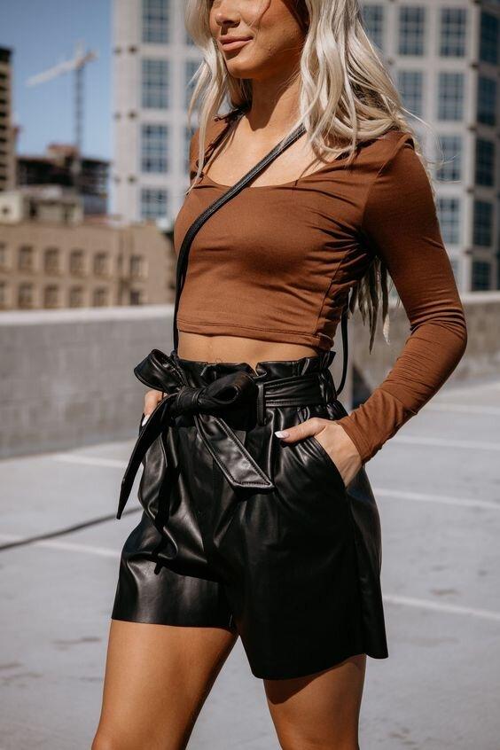 Более эффектный и стильный вариант шортов — кожаные бермуды или трендовые микро-шорты. Бермуды за счёт длины подходят как на работу, так и на повседневку. Всё зависит от верха, с которым их сочетают, а также обуви, сумки и украшений.