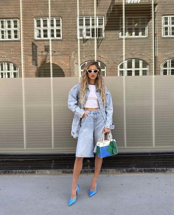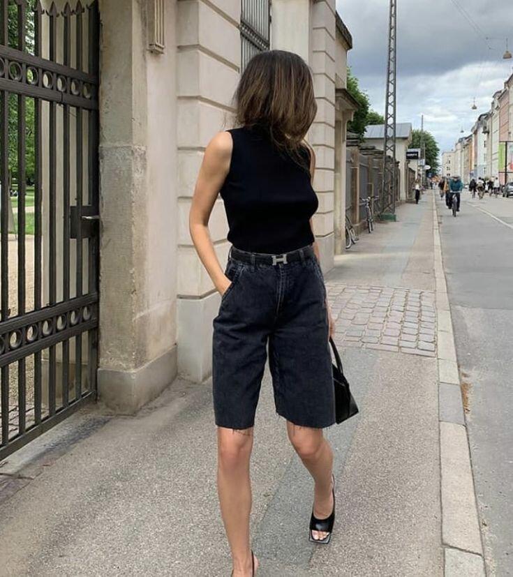- Тренд: прямые или расклешенные джинсовые шорты до колена