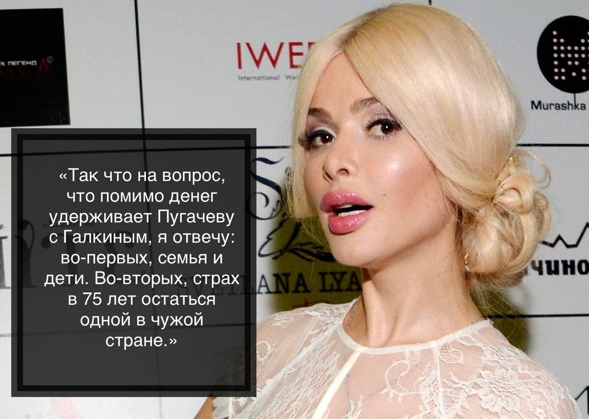 А Кравец, упомянув приличный возраст Пугачевой, права — но лишь наполовину. Да, в 75 лет многим людям трудно даже жить одним — не то что в чужой стране. И практически вся жизнь — с концертами, записями, славой — уже в прошлом. Ну а Галкин* разве не в похожем положении? Вздумай он разойтись с женой — кому он окажется нужен и интересен?