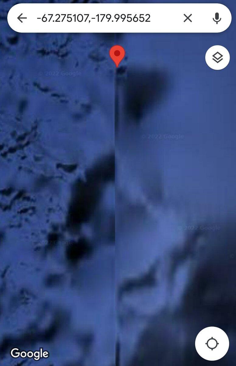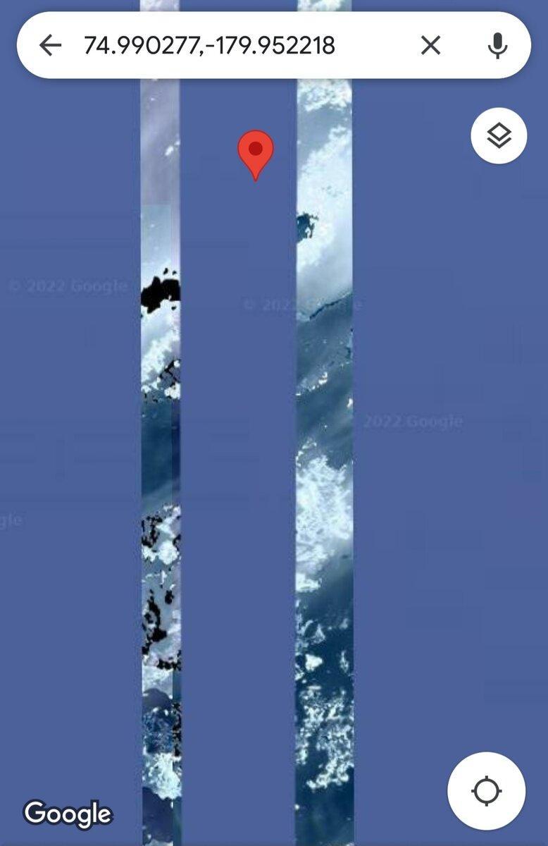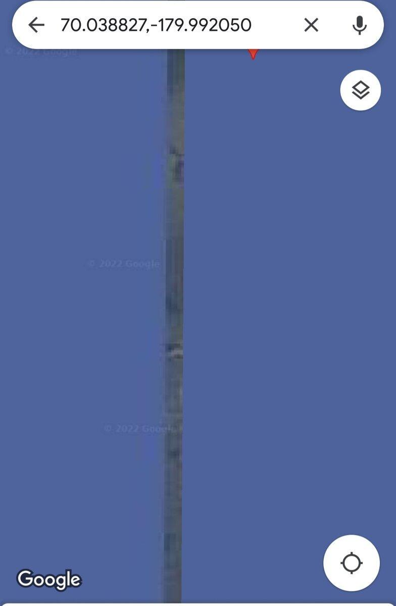На севере от нашей страны находится Северный Ледовитый океан. На гугловских снимках он чаще всего сине — голубой. Но в этой полосе, которую назвали «стеной», за счёт склейки не заретушировали настоящие снимки нашего СЛО, и в этих снимках очень много каких-то земель, однозначно. Там не просто вода, или лёд, а именно суша, покрытая льдом.