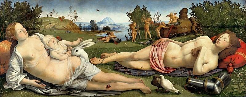 Ироничный подтекст, легко разгадываемый во все времена, состоит также в том, что мужская привычка засыпать после акта любви была постоянным предметом непристойных шуток в Италии эпохи Возрождения. В этом аспекте копьё и раковина могут быть рассмотрены в качестве сексуальных символов.