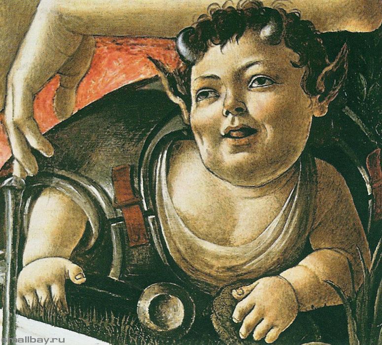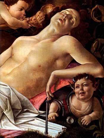 Но Боттичелли решил придать композиции шутливый характер — мальчишки пытаются напялить на себя огромные латы и шлем, дерутся за обладание копьём. Один малыш дует Марсу в ухо маленькой раковиной, пытаясь, пока безуспешно, его пробудить.