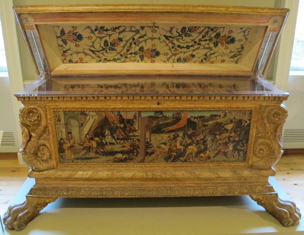 Необычен и формат картины, написанной на длинной и узкой доске. Вполне вероятно, что работа предназначалась для боковой стенки свадебного сундука (кассоне) — размер доски (69 × 173 см) вполне соответствует типичному размеру панели брачного сундука.