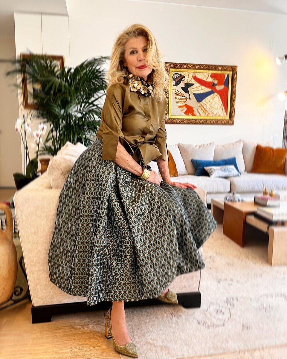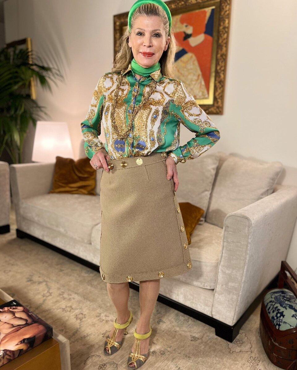 Однако чаще всего носит именно принтованные брюки и юбки, потому что они находятся далеко от портретной зоны и привносят разнообразие в образ. Всё таки возраст за 70 — ещё не повод наряжаться с головы до ног с строгую классику.