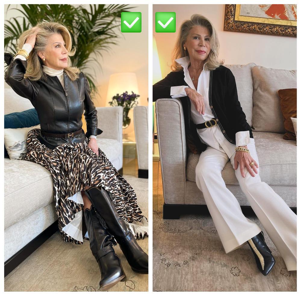 Она акцентирует талию ремнём, кроем жакета или даже мини-корсетом из кожи. Эта модная хитрость уже всем известна, но ей не всегда пользуются дамы 70+, так как многие предпочитают стать невидимкой.