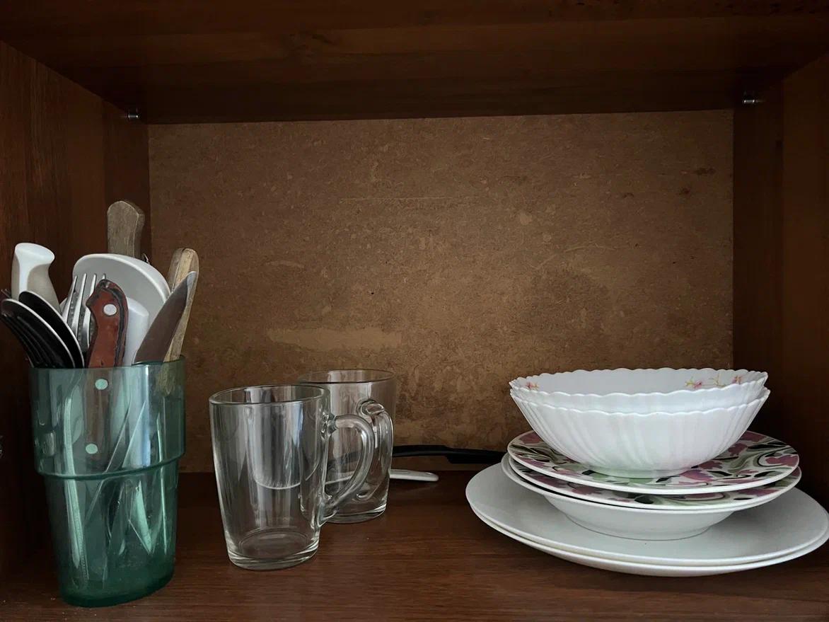 Мебель и приборы потрепанные жизнью, но чистые и в рабочем состоянии. Постельное бельё, два больших полотенца. Для посуды новая губка и кухонное полотенце. Набор посуды на двоих. Соль, сахар, растительное масло.