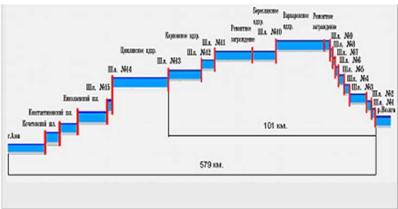 Перепад уровней около 54 м. Чтобы их преодолеть хватит построить 6-8 шлюзов, что существенно сократит время прохода судов.
